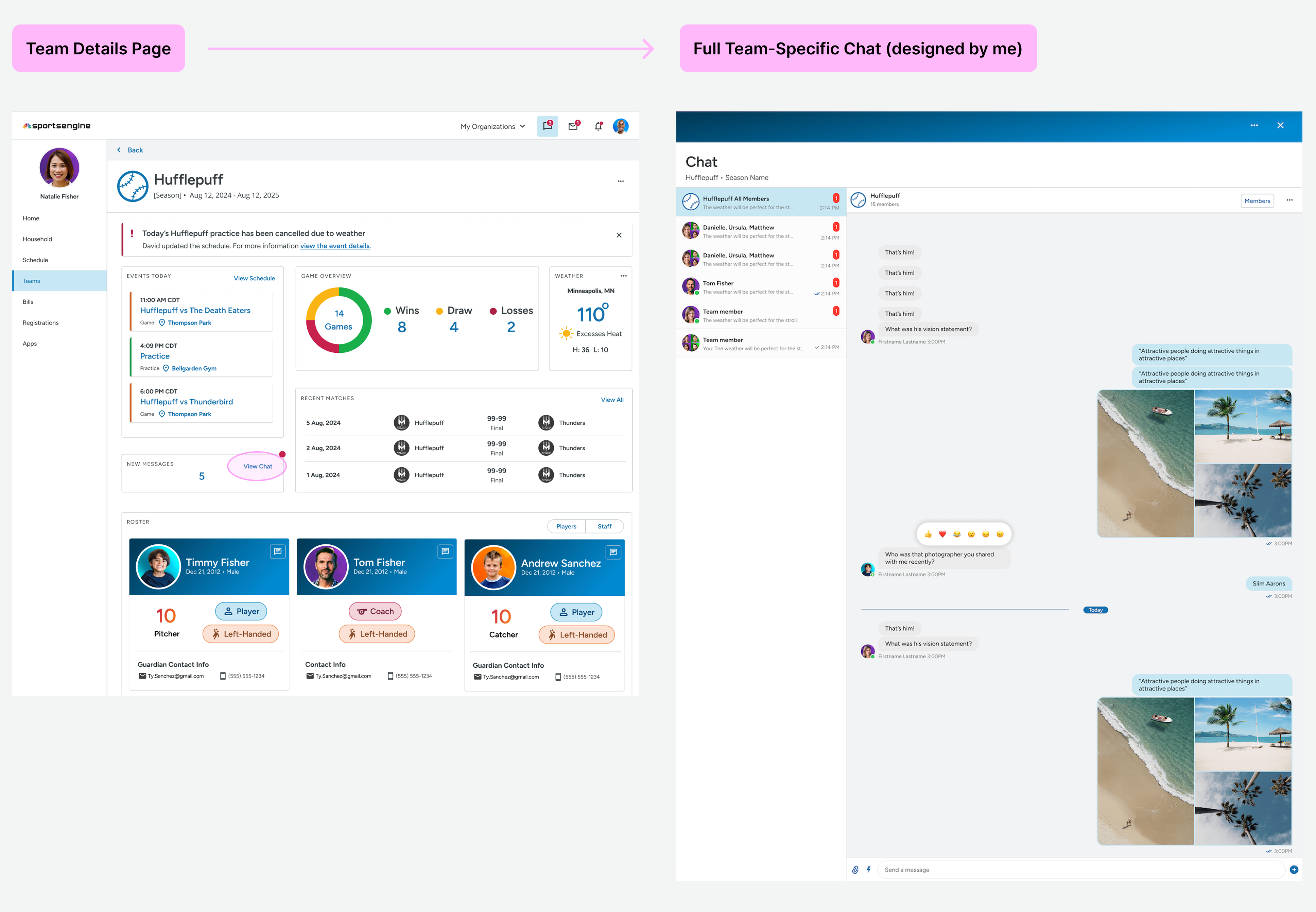 The blue text links out to the full page panels that displays a comprehensive view of both the team schedule and chat.